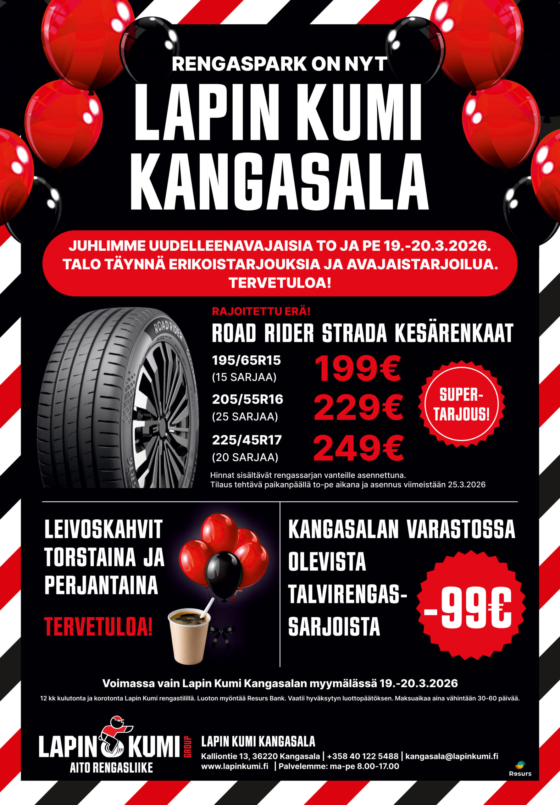 Toivotamme kaikki uudet ja nykyiset asiakkaat tervetulleeksi Kangasalan rengasliikkeen uudelleen avajaisiin! Tarjolla on huippuhyviä tarjouksia kesä- ja talvirenkaista. Lisäksi tarjolla on kahvia ja makeaa. Koko henkilökuntamme on paikalla kertomassa toiminnastamme ja palveluistamme lisää.